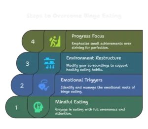 Stopping binge eating isn’t about willpower — it’s about breaking old patterns and building new habits. With a few simple, steady changes, you can start feeling more in control and at peace with food. Let’s look at some practical steps to help you get there.